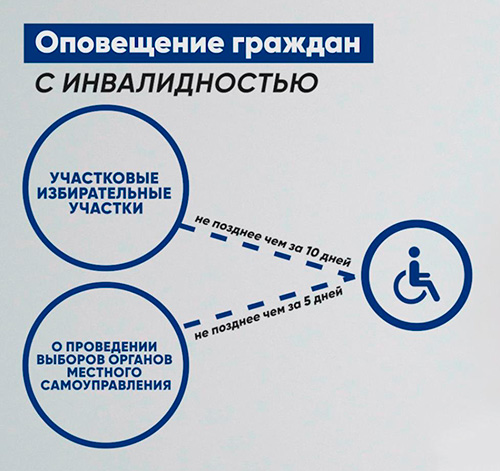 Участковые избирательные комиссии обеспечивают оповещение граждан с инвалидностью о времени и месте голосования не позднее, чем за 10 дней. А при проведении выборов членов иных, кроме маслихатов, органов местного самоуправления не позднее, чем за 5 дней до дня проведения голосования через средства массовой информации, а также иными способами, доступными гражданам с инвалидностью.