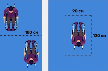 В коридорах и зонах поворота следует предусматривать участки для разворота или разъезда колясок. Минимальное пространство для этого 90см*150 см.