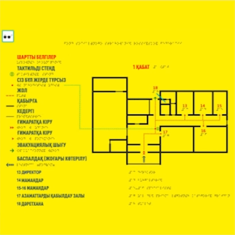 Мнемосхема на входе. В социально значимых зданиях – например, школах, больницах, центрах голосования – должна быть размещена мнемосхема. Это тактильный план здания с условными обозначениями, который помогает незрячим и слабовидящим людям понять расположение помещений. Устанавливается в 3–5 метрах от входа с правой стороны. Она включает: схему всех помещений, обозначения зон, шрифт Брайля, элементы озвучки (по возможности).